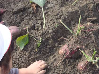 手のスコップで,少し土を掘るとお芋が顔を出しました。なんだか,大きいお芋が入っているようで,わくわくします。