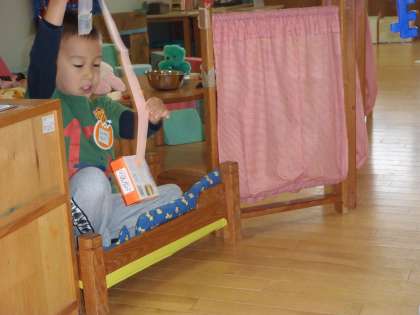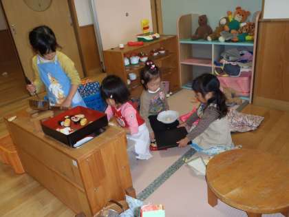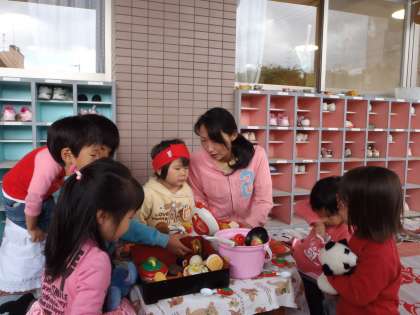 それからは,次々にあそびが始まりました。魚釣りが始まったり,テラスのござの上にご馳走が並んだり,保育室でもおうちごっこを楽しんだりなど,3歳児の世界がいっぱい広がった1日でした。