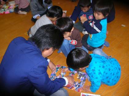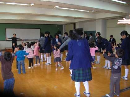 まず,運動会でも一緒に踊った“ぼくのおひさまパワー”のダンスを踊りました。体を動かした子どもたちは,緊張もほぐれ,中学生の皆さんが準備をした遊びの場に参加しました。一緒に遊んだり,言葉を交わしたりしながら,温かい雰囲気の中で進められました。大きなお兄さん,お姉さんに大切にされている心地よい思いを感じたひと時でした。
