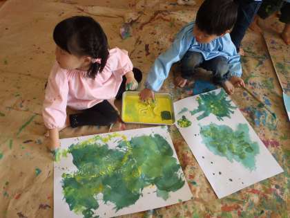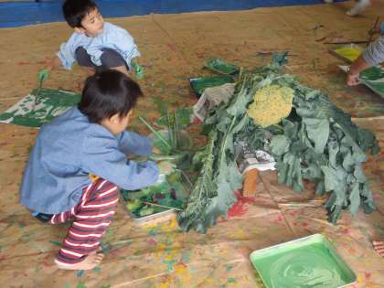 そして今日,ばら組がえのぐでかきました。紙の上で,色を混ぜ,変化していく様子を喜んだり,ふと筆をのびのびと動かしブロッコリーの面白い形を表現したりしていました。いろいろな表現がありました。何よりも子どもたちが画面に向かっていく姿勢に,成長を感じました。