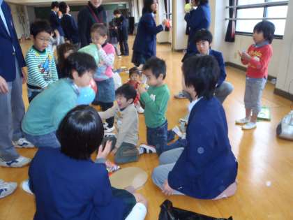 それが終わると「ぼくのおひさまパワー」のダンスを一緒に踊りました。それからは,それぞれの班に別れいろいろな遊びを中学生と幼稚園の子どもたちが楽しみました。