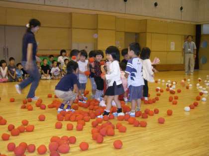 そしてその後,紅白球で遊びました。赤や白の玉をかごから出して広げるのは,たんぽぽ組ともも組の子どもたちが頑張りました。