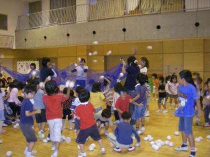 その玉でばら組とゆり組が玉入れをしました。その後,全員で全部の玉をネットの中に投げ入れる玉入れを楽しみました。ネットの中に投げ入れるのは,たんぽぽ組やもも組の子どもたちも張り切って参加することができました。
