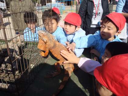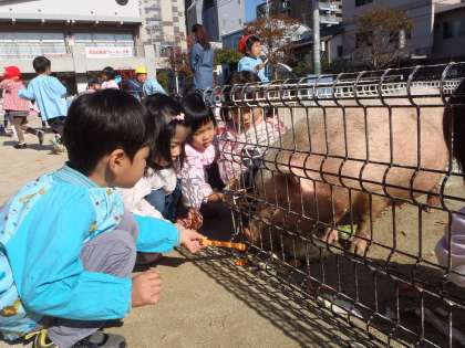 「動物たちのお母さんになるんだよ」「かわいいと言うと動物たちは喜ぶんだよ」と教えてもらい広場で動物たちと遊びました。家から持ってきた野菜を手に持って,やさしく口に運びます。そばで動物たちの表情を見たり,そっと体を触ったりして,いろいろな動物たちと触れ合って遊びました。