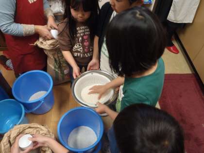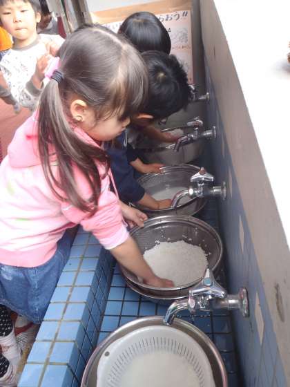 ゆり組の子どもたちは,もち米を洗いました。丁寧にゆっくり,洗っていました。玄関ホールに並べられたもちつきの道具を見て,年少・年中組の子どもたちも,何だか,気持ちがワクワクしてきたようです。さあ,明日が待ち遠しいですね。お天気になりますように!!