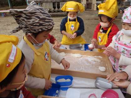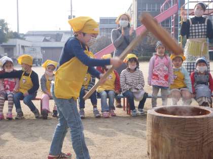 はじめに,白むしをゆっくり味わって食べました。さあ,ゆり組からもちをつきます。力強くつきました。みつば幼稚園で,3回目のもちつきですね。今年も良い経験が出来ました。次は,ばら組。ゆり組に負けないくらい,力を発揮していました。最後は,もも組とたんぽぽ組です。小さな臼とかわいい杵でもちをつきました。初めてのもちつきです。多くの大人に見守られてペッタン・ペッタン,もちつきを経験しました。