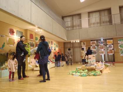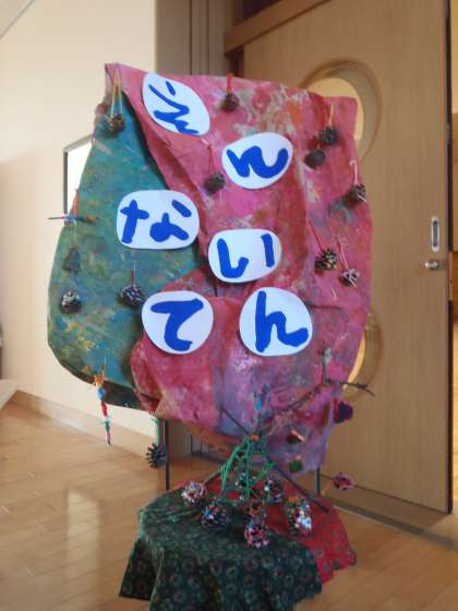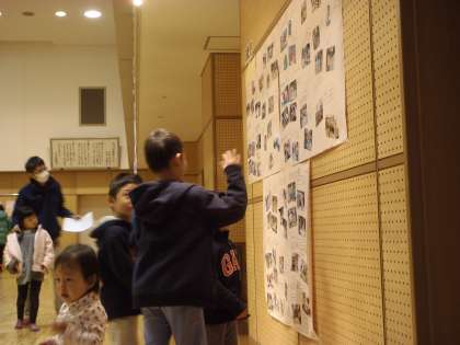 本日は,休日にもかかわらず,ご家族で園内展にお越しいただきありがとうございます。子どもたちは,自分の絵を見つけて,ちょっと自慢げにお兄ちゃんに教えたり,「○○ちゃんのもあるよ」と友達の絵や作品を見つけたりなど,おうちの方と一緒にゆったりといろいろな絵や作品を見ていました。大人の方たちは,