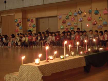 今日の遊戯室は夢のような不思議な世界に変身しています。子どもたちがつくったプレゼントバックや長靴・サンタさん,色とりどりのローソクも飾ってあります。子どもたちみんなが集まり,楽しみにしていたパーティーの始まりです。ダンスをしたり,各クラスが歌を歌ったりしました。そんな時,どこからかリンリンリンと鈴の音が聞こえてきます。みつば幼稚園にもサンタさんが来てくれました。