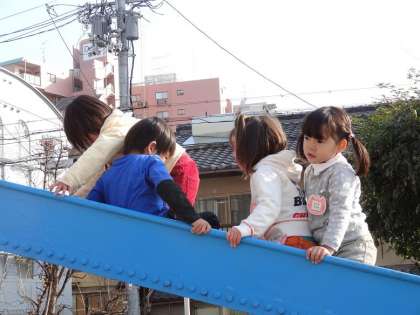 3歳児の子どもたちは保育室の前にある滑り台が大好きです。