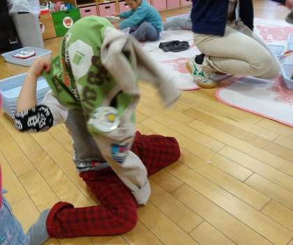 ランニングシャツの腕を通すところに頭を入れてしまい四苦八苦している子どもも,なんとか脱いでもう一度着ようとしています。