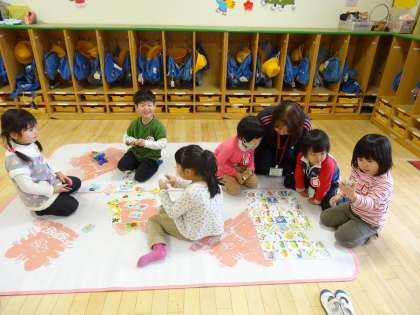 4歳児のばら組の保育室をのぞくと,カルタで遊んでいる子どもたちがたくさんいました。