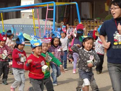 自分がつくった鬼のお面をつけて,小鬼たちがいっぱい園庭へ出てきました。