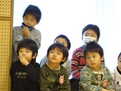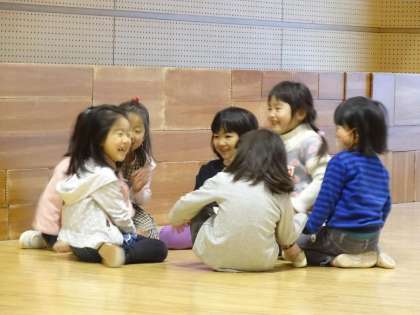 4歳児のばら組が,遊戯室に集まっています。