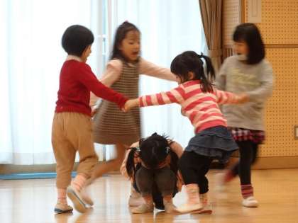 遊戯室の真ん中でかごめかごめを始めた子どもたちを,他の役の子どもたちがじっと見つめています。