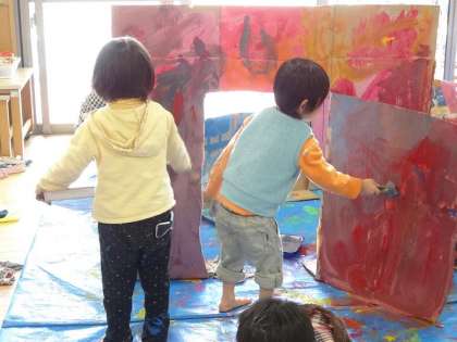 絵の具を使って友達と気持ちを合わせて取組んでいました。