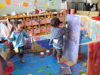 もくもくと壁に色をぬっている子どもや,うれしくて踊りながらぬっている子どもなど様々なです。