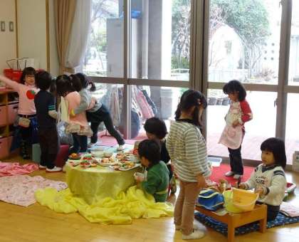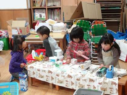 昨日たんぽぽ組は遊戯室の遊びの中で,お薬やさんがとっても楽しく,その気持ちはずっと続いて,今日は保育室でお店やさんの店舗をつくっていました。