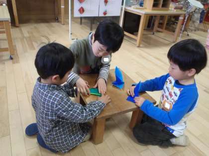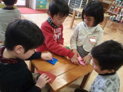 5歳児のゆり組が折り紙の先生です。