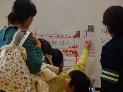 幼稚園に帰ってきた人から,今日歩いた地図の上に気をつけなければならないと感じたところに赤いシールを貼りました。