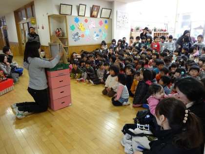 園長先生からおひなさまの由来や願いのお話をきいたり,一緒にひなまつりの歌をうたったり,紙芝居を見たりしました。