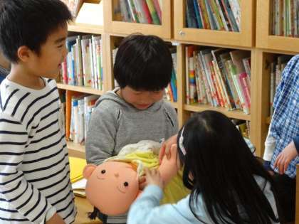 ゆり組は,身長と体重も赤ちゃんと同じようにつくられている人形を抱っこしました。