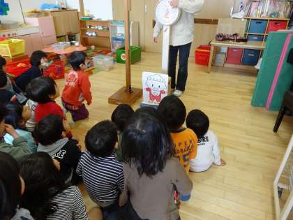 6日には5歳児のゆり組が,7日には3歳児のもも組とたんぽぽ組,4歳児のばら組が保健の先生から保健指導を受けました。