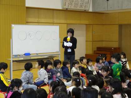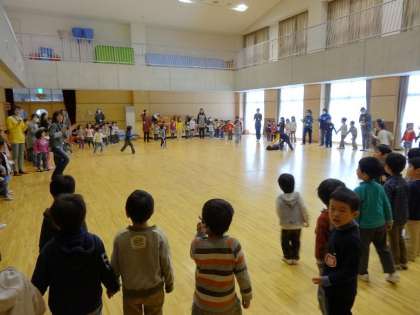 お楽しみは,みつば幼稚園の子どもがみんな一つづつ大きくなったので,「誕生月なかま」の遊びをしました。