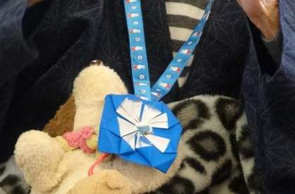 色紙で折ったペンダントのプレゼントを持っての訪問です。