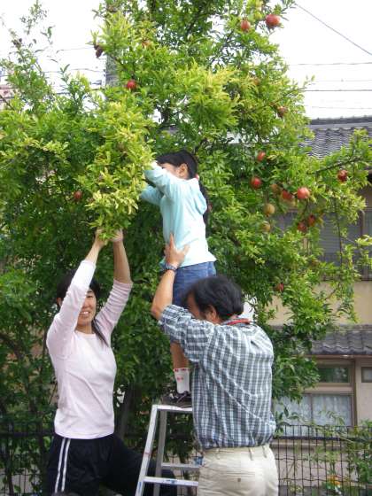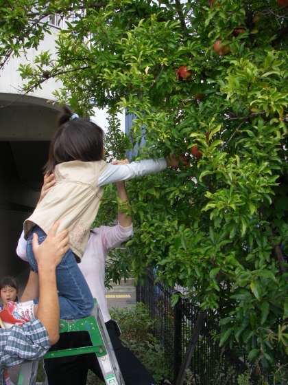 ようやく収穫の日がやってきました。梯子に登り,恐る恐る手を伸ばしてざくろを収穫しました。下で待っている時に目星をつけて,遠くても「これ」と決めたものを収穫している子どももいました。もっただけですぐにとれた人やくるくると回してもなかなか取れない人もいましたが,みんな一つずつ収穫しました。