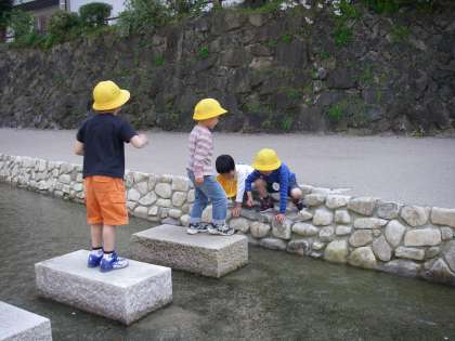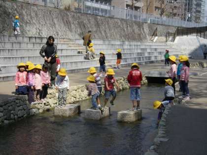 4月7日,新学期が始まって2日目です。3月にようやく通水した堀川は,幼稚園のすぐ近くです。年長組の子どもたちだけで堀川へ遊びに行くことにしました。子どもたちはどんどん探検したり,川の中に入ったり,飛び石を飛んでわたったりしていっぱい楽しんで遊びました。とても良いお天気で,桜も満開。「また来たい!」と子どもたちも先生たちも思いました。