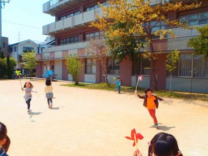 風車が完成すると、子どもたちは広い園庭を走って風を受け、風車を回して楽しみました。