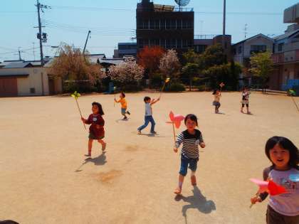 3歳児や4歳児の子どもたちが、ゆり組の風車を見つけて「あれ、なに!」と目を輝かせていました。お兄さん、お姉さんのように風車を持って走りたいようです。