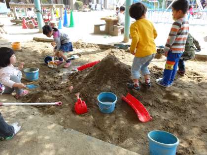 砂や水は自由に形が変わるので、いろいろな試しをしたり、思ったことを実現できたりします。一人ひとりが感触を楽しみながら十分楽しんでほしいと思っています。