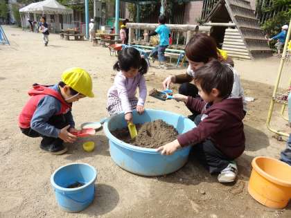 3歳児は保育室前にたらいを持ってきて、すぐに先生やお友達が見えるところで砂遊びを楽しんでいます。たらいの中をかき混ぜたり、砂をお皿に乗せたりして、先生のそばにいることで安心して遊ぶ姿が見られます。