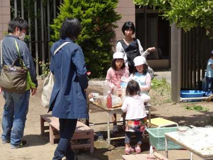 総会の後は保育参観です。今日はよいお天気で、年長児たちがすり鉢で葉っぱや花びらをすり、色水をつくっていました。それぞれが好きな遊びを見つけて遊んでいる様子を参観してしていただきました。