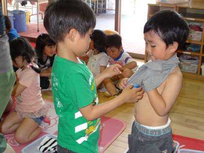 服を脱いだり着たりするのを5歳児のゆり組のお兄さん、お姉さんが手伝ってくれました。
