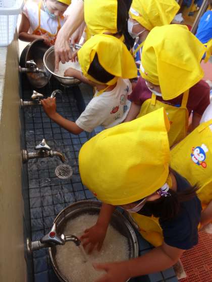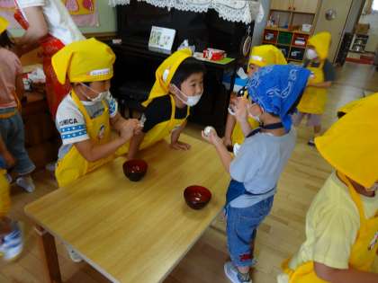 5歳児のゆり組がお米をといで、おにぎりをつくってくれました。
