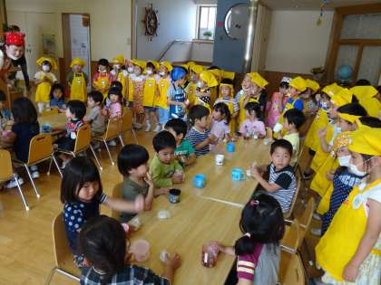 3歳児と4歳児は5歳児からもらった「まめごはん」のチケットを持って、豆ごはんパーティー会場にきました。