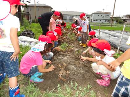 土を掘るといろいろな生き物が出てきてびっくりしましたが、たくさんのおいもがほれました。その後、サツマイモ苗を植えました。