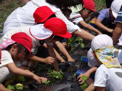 5歳児は前回植えたポップコーンに水遣りをし、サツマイモ苗を1人2〜3本植えました。