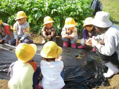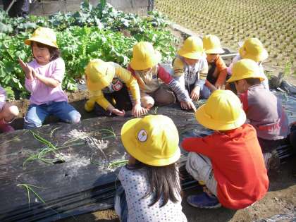 一人3粒ずつ,えんどう豆の種を蒔きました。お水もたっぷりあげてそして次は,タマネギの苗を植えました。タマネギの苗は,とても細くて,土に埋めるのが難しそうでした。でもみんなで頑張って150本近くの苗を植えました。