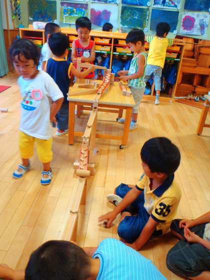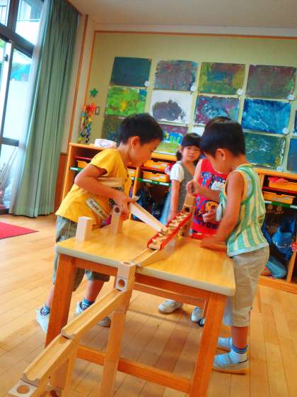 5歳児が積み木を使ってビー玉ころがしのコースをつくりました。