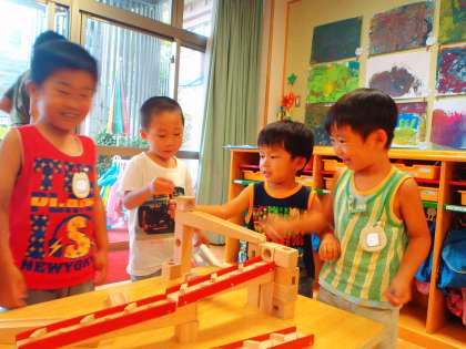 友達と相談しながら、高さや傾斜を考えながら積み木を並べています。