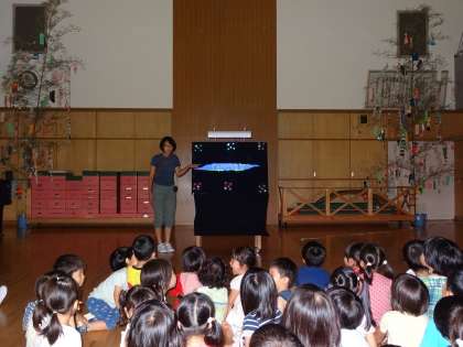 ブラックシアター(暗いところでブラックライトという光を当てると光って見えるパネルシアターです。)で七夕のお話を聞きました。