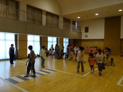 その後、遊戯室内に模擬道路をつくり、道路を歩く練習をお家の人と一緒にしました。