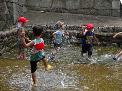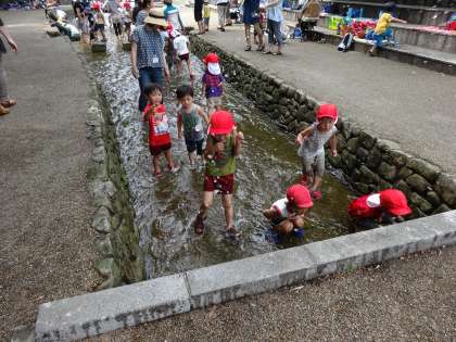 子どもたちは早速川遊び用の靴に履き替えて、堀川で遊び始めました。