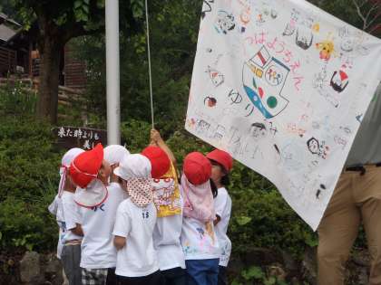 みんなで幼稚園の歌を歌ってゆり組の旗を揚げました。