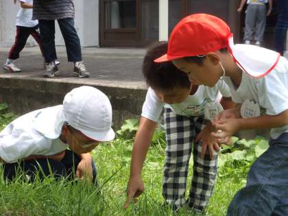近くの原っぱにはトンボや小さなバッタがいっぱいいました。お弁当のおにぎりを食べた後、早速虫さがしです。