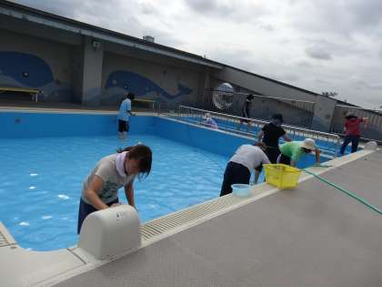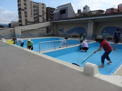 夏休みの間お休みしていたプールを、幼稚園の教職員みんなで掃除をしました。