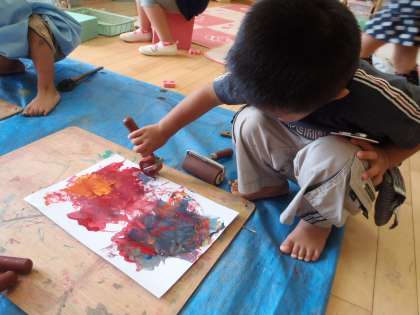 いろんな色を重ねていくうちに,手や足に絵の具をつけ出したBちゃん。
